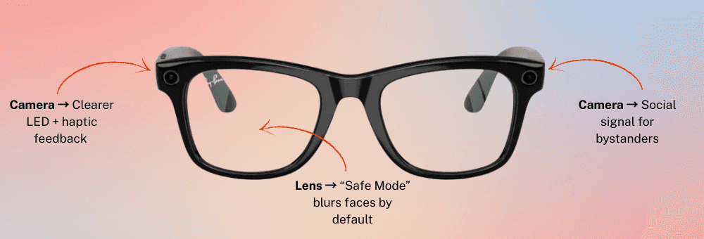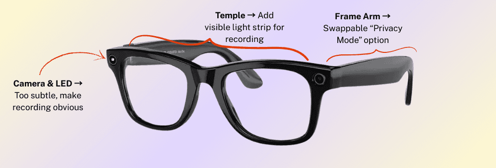 Proposed improvements include clearer recording indicators, haptic and audible feedback, and swappable ‘Privacy Mode’ arms to reassure both wearers and bystanders.